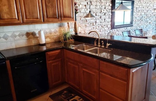 The Condo has a fully equipped kitchen with granite counter tops including all appliances as refrigerator, electric stove and oven, mounted microwave with exhaust fan, coffee maker, blender, toaster, dishwasher, glasses, pots, pans, and silverware. There is a Reverse Osmosis water system for filtered water at sink. Unit is equipped with air conditioning and heating, pirvate Wifi and Roku TV. The Laundry room has a washer and dryer for your use.