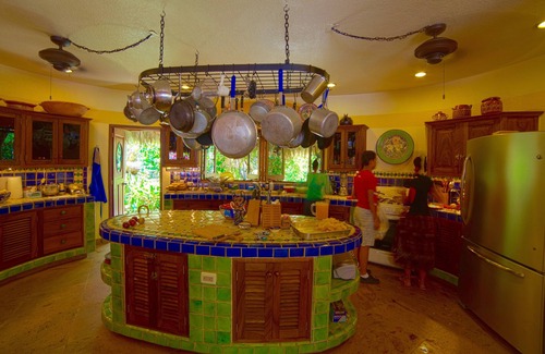 The living area ("Main Palapa," a. k. a. Sala Grande) and kitchen are sheltered under a massive palapa that opens out to gardens and the private pool. The full-service kitchen is spacious, modern, and is run by Moña Delgado, your cook/housekeeper. The round marble dining table in the center of the open living area seats up to14 and was hand-crafted by artisans in Guadalajara.