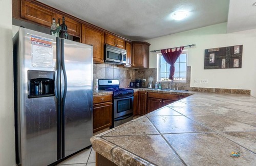 The kitchen is outfitted with a complete set of stainless steel appliances including side-by-side refrigerator . The breakfast bar is the place to share meals and plan where to go and what to see in San Felipe.