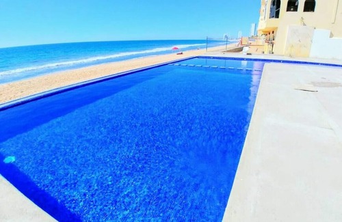 Departamento para 8 personas, cuenta con sala, cocina integral, comedor, 2 recamaras, la recámara principal cuenta con cama king size y baño privado y con closet, la segunda recámara con literas (cama matrimonial y 2 individuales) y closet, el otro baño está en el área de sala comedor, en la sala hay un sofá cama matrimonial con agradable vista al mar y a una de las albercas, estacionamiento gratuito, Wifi y una alberca funcionando, frente al mar. Dile babay a la rutina. ¡Bienvenido!