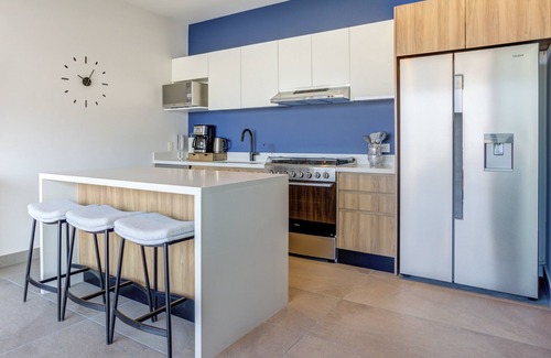 Living Area: The open-concept living area is filled with natural light, with large windows offering stunning views and a seamless connection to your private balcony. Tastefully decorated with vibrant, Mexican-inspired decor, the space exudes warmth and style.
