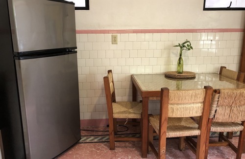 Vintage style furnished 3 bedroom, 3 bathroom home with private terraces and enclosed garden. Surrounded by lush gardens, palm trees. Villa Las Rosas is a two level, 3,500 sq.ft. home. The two bedrooms, each with en-suite bathrooms, a fully equipped kitchen, living & dining area, terrace, garden and laundry area are all on the first level. The upstairs penthouse has a private terrace, glass French doors opening to the bedroom and living/dining area with a wood burning fireplace. In an alcove there is a double bed and the full size bathroom features a large tile tub with shower.