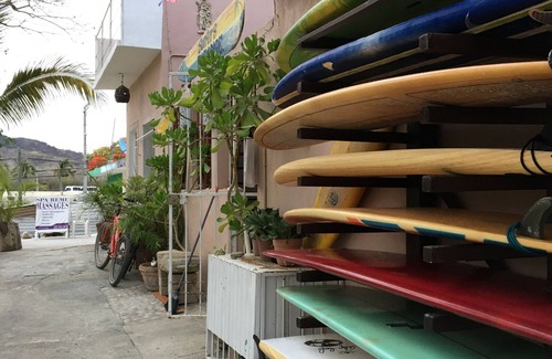 Excellent location centered in the heart of Punta de Mita 4 minutes walking to 2 surf beaches stinkys and el Anclote. This basic room accommodation has its own bathroom sink and shower and a refrigerator and coffee maker and good WiFi . This location has a common shared kitchen around back with a gas stove and pots and pans for cooking. We have surf boards for rent for 150’pesos a day for soft boards and 300 pesos per day for longboards and fiberglass boards. Enjoy the local lifestyle in this place
