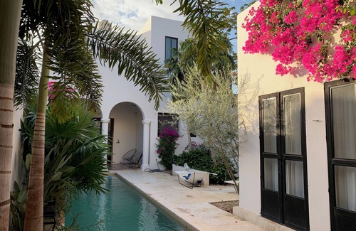 Sometimes when travelling you stay somewhere so perfect it becomes a destination itself. Elegantly styled with authentic historical charm and contemporary comforts, you will find this 4 bedroom home a serene and comfortable oasis in a convenient location in Merida's centre, near Santiago square. The original historical pasta tiles, 18 foot ceilings and historical details give the house an otherworldly charm to complement visits to the gorgeous historical sites of Merida. Contemporary details and dreamy white linen curtains, refreshing palm fringed private pool and colourful bougainvillia cascading over the walls and balconies give perfect holiday vibes. One of my guests described staying in the house as 'feeling like a millionaire novelist." The house is a short walk to the fresh fruit, veg and flower market at Santiago Park (open every morning). Only 15 mins from the airport, and 10 mins walk to Santa Lucia square and Plaza Grande. Beautiful spacious rooms with a variety of spaces indoors and outdoors to enjoy. With 5 beds ( 3 queen and 2 twin) the house sleeps 6 comfortably. Spacious enough to accommodate 2 families but also suitable for a couple. The front rooms were once used as an art gallery.