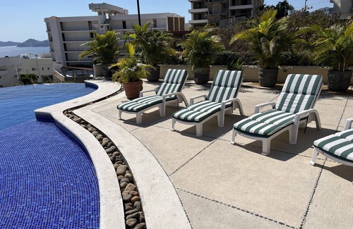 La estancia con Palapa , Comedor, alberca grande con su vista increíble a la bahía es perfecta para disfrutar los atardeceres y los fuegos artificiales en la noche de año nuevo. El servicio de limpieza va incluida.